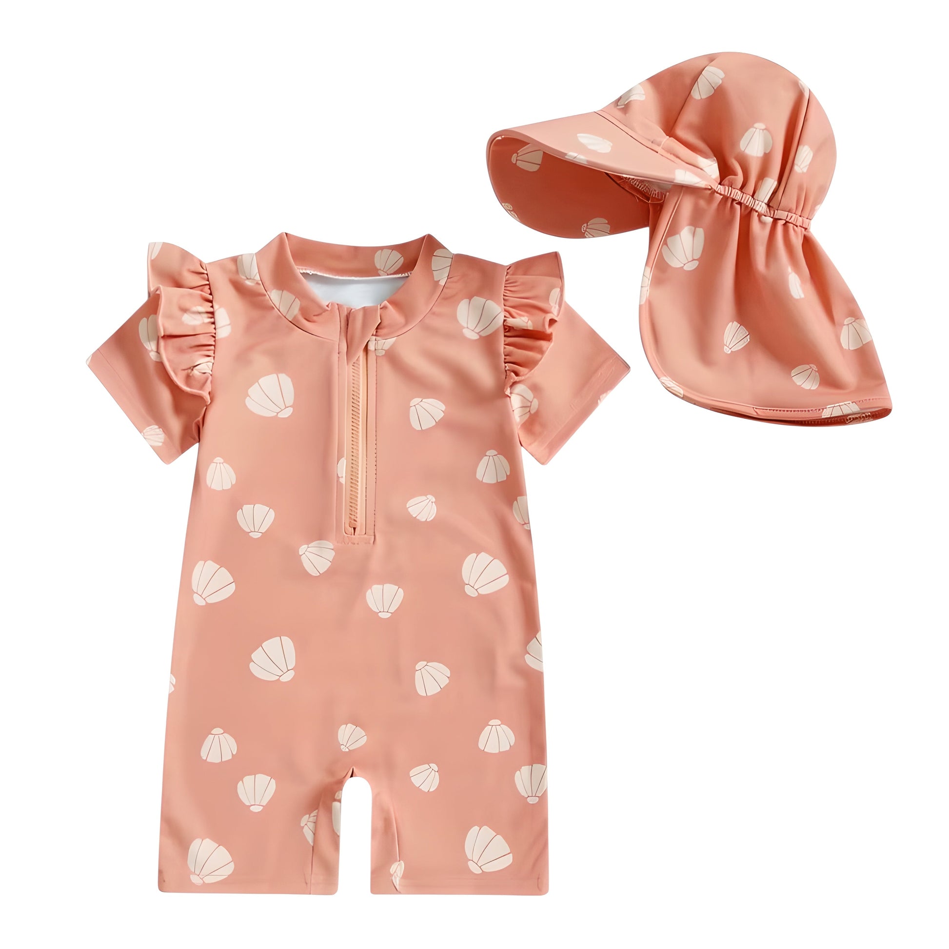 DESIGN: This romper baby bathing suit designed shell print, short sleeve, fly sleeve, front zipper closure, stretch fabric can stretch horizontally, vertically and obliquely, which allows the kids to play freely.