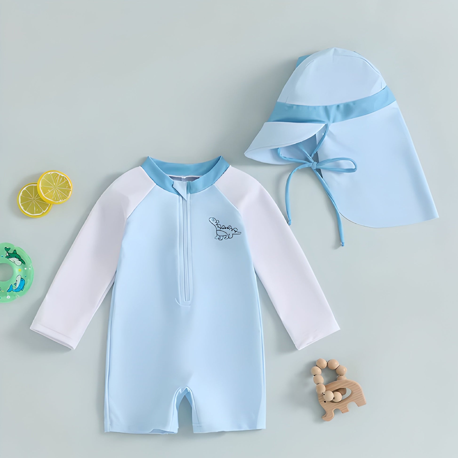 This adorable 0-3Y Boys Swimsuit features a fun dinosaur print, making it the perfect pick for your little adventurer. Designed with long sleeves for extra sun protection, it ensures comfort and safety during beach days or poolside play. Complete with a matching hat for added coverage, this swimsuit is both practical and playful, offering a stylish way for your child to stay cool and protected in the sun.